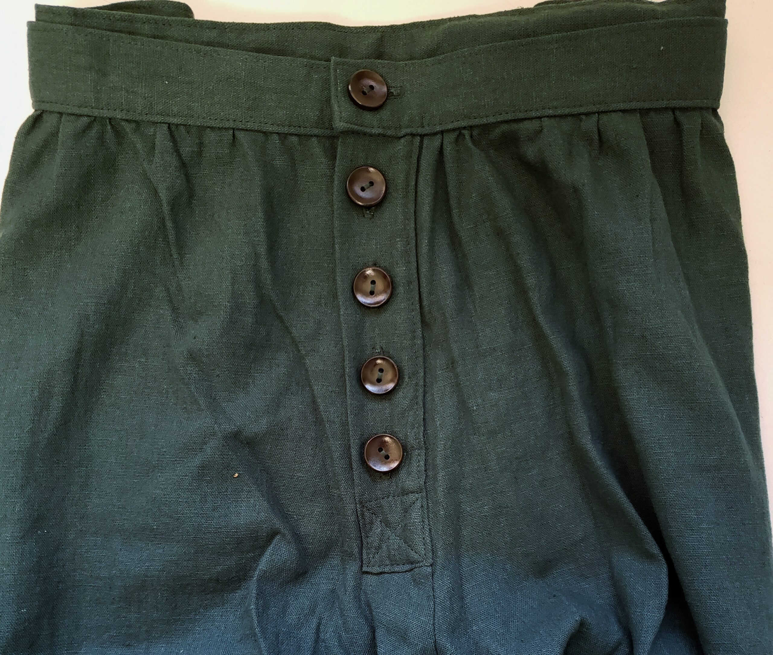 Features include a 5 button fly, button cuffs, set-in waistband. Buttons are wood. Made from medium weight linen for great wear and great comfort and because it gets HOT at events. The generously cut fabric is gathered into the waistband for easy movement.
